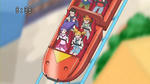 遊園地でグループデートをするプリキュア3人娘と男の子達がジェットコースターに乗るシーンである。